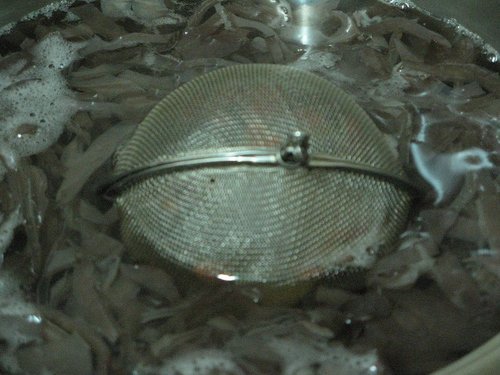 1.將所有乾燥材料用清水沖一下,裝入濾網中裝好